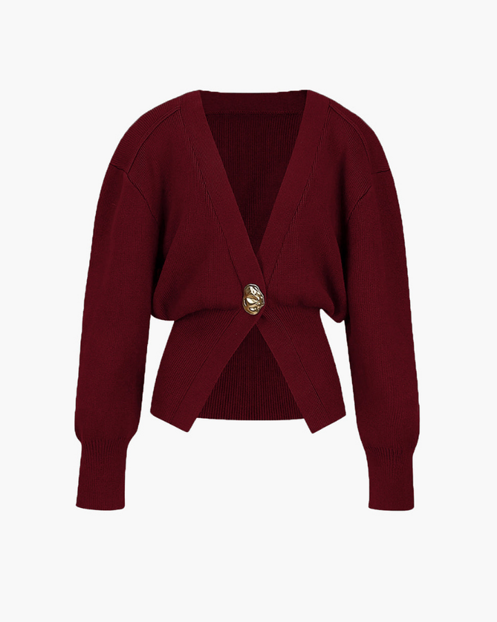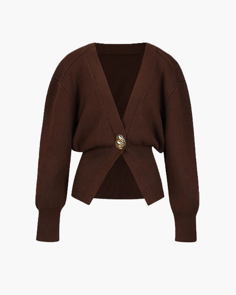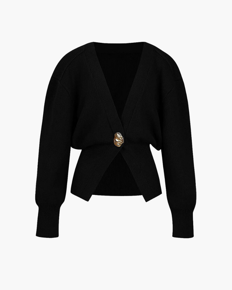 • With its figure-enhancing fit, striking gold button closure, and classic V-neckline, this cardigan exudes a polished and luxe finish that elevates any outfit.