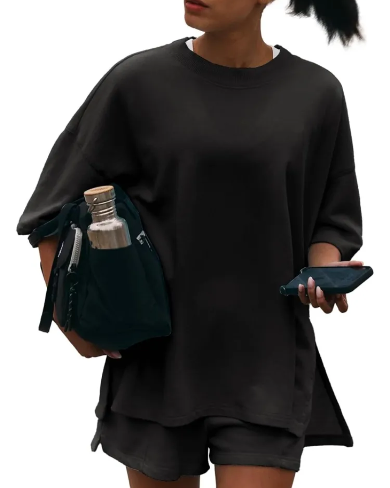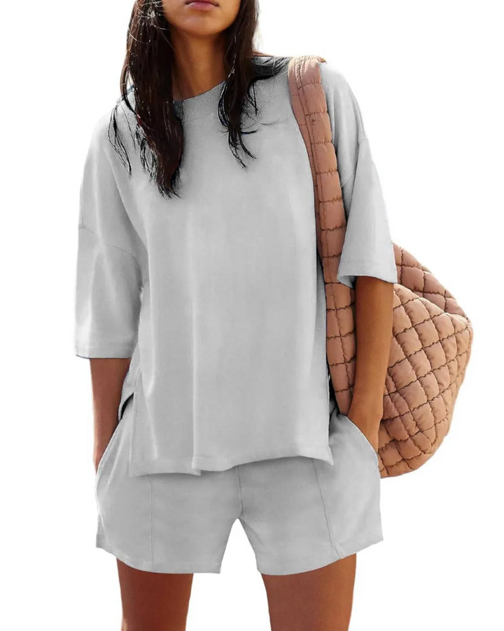 Relax into the day with this breezy lounge set, designed for chic comfort and simplicity. The oversized top and relaxed-fit shorts offer unrestricted movement and an easygoing vibe perfect for slow mornings or stylish errands. A timeless neutral palette makes this your go-to everyday essential.